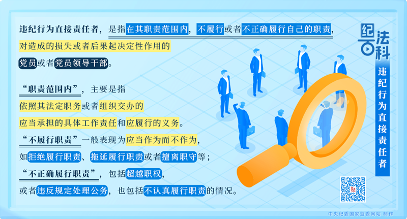 違紀行為直接責任者,是指在其職責范圍內(nèi),不履行或者不正確履行自己的職責,對造成的損失或者后果起決定性作用的黨員或者黨員領(lǐng)導干部。