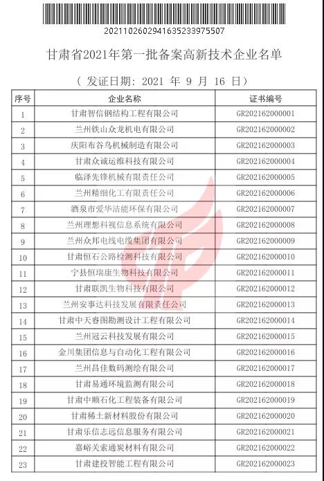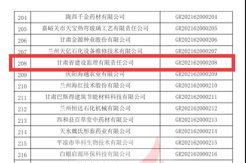 中標甘肅省引洮供水二期配套城鄉供水信息化專項工程方案、招標設計及施工圖設計項目;平涼市崇信縣棗林溝水庫工程;萬州區魚背山水庫大壩安全評估報告編制;協合拉引水樞紐、秋格爾引水樞紐、英爾引水樞紐安全評價項目。中標蘭州中川機場三期擴建供油工程項目機坪航站區工程勘察。根據《高新技術企業認定管理辦法》和《高新技術企業認定管理工作指引》有關規定,全國高新技術企業認定管理工作領導小組辦公室于10月26日正式公布了甘肅省2021年第一批備案的294家高新技術企業名單,建設監理公司榜上有名,被評定為“高新技術企業”。