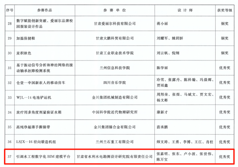 在甘肅省第七屆BIM技術(shù)應(yīng)用大賽中,建筑設(shè)計(jì)院、水電設(shè)計(jì)院報(bào)送的項(xiàng)目共斬獲12項(xiàng)獎(jiǎng)勵(lì),包攬了設(shè)計(jì)組16個(gè)獎(jiǎng)項(xiàng)中的10項(xiàng)。在甘肅省第五屆“創(chuàng)新杯”工業(yè)設(shè)計(jì)大賽中,水電設(shè)計(jì)院《引調(diào)水工程數(shù)字化BIM建模平臺(tái)》項(xiàng)目獲優(yōu)秀獎(jiǎng)。在第十七屆全省職工優(yōu)秀技術(shù)創(chuàng)新成果獎(jiǎng)中,水電設(shè)計(jì)院、土木工程院申報(bào)的兩個(gè)項(xiàng)目分獲創(chuàng)新成果獎(jiǎng)三等獎(jiǎng),其中,《棄渣場(chǎng)三維設(shè)計(jì)平臺(tái)》項(xiàng)目是全省水利系統(tǒng)唯一獲獎(jiǎng)成果。