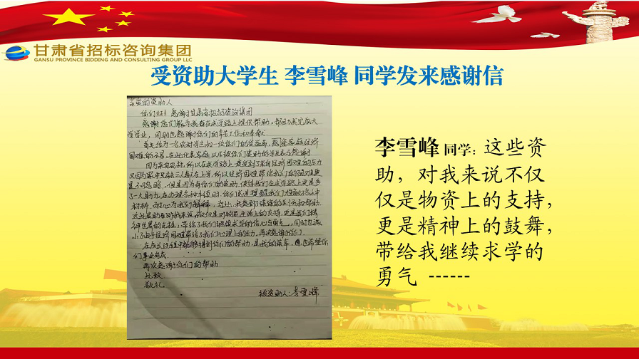 近日,張家川縣張棉驛鄉(xiāng)張棉村貧困大學(xué)生代表劉國(guó)熙、周長(zhǎng)斌、李雪峰等向甘肅省招標(biāo)咨詢集團(tuán)有限責(zé)任公司發(fā)來感謝信,就招標(biāo)咨詢集團(tuán)給予學(xué)費(fèi)資助一事表達(dá)他們的感激之情。