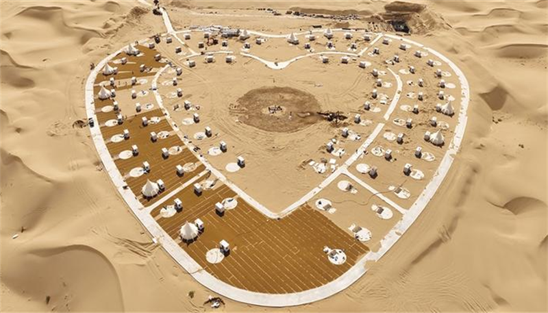項目占地面積約13.33公頃,總建筑面積15952㎡。建設內容包括游客服務中心、休閑中心及230座帳篷設施等。設計以優美的異形建筑為中心,錯落有致的帳篷環繞四周,如繁星點綴在沙漠中,形成一道優美的風景線。