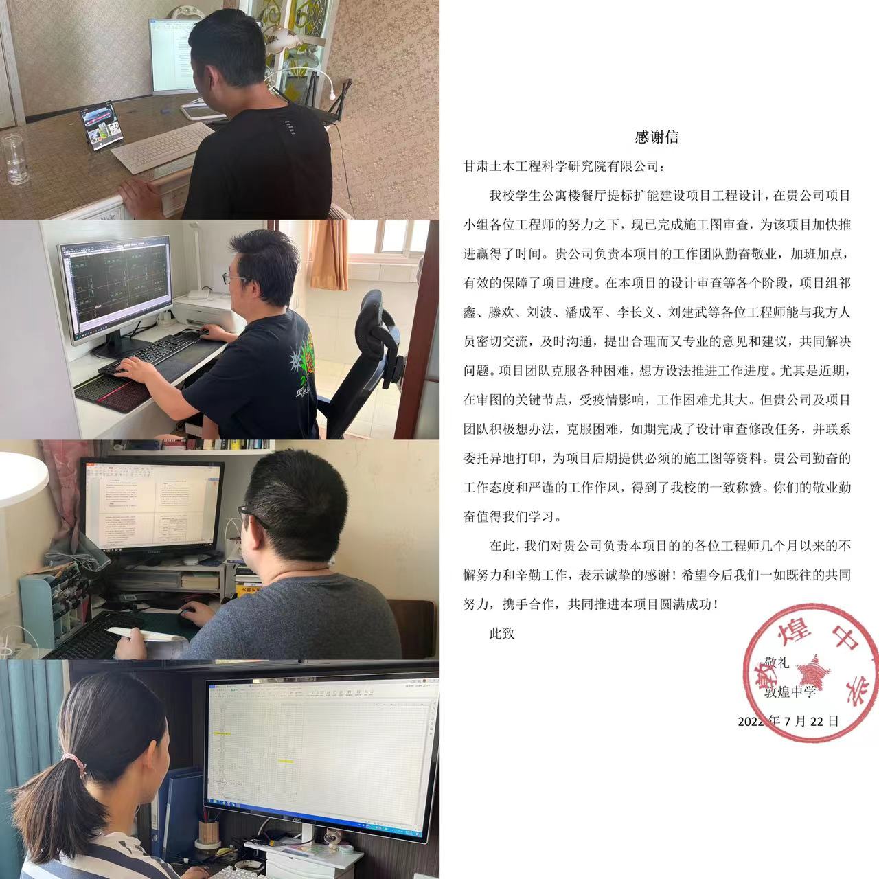 設計一所堅決貫徹土木工程院黨委要求,第一時間部署疫情防控工作。在部門職工居家辦公期間,積極與軟件公司溝通協調,為所有設計軟件增加了在線使用版,并利用釘釘、微信進行線上溝通,疫情期間完成了2022年華亭市安口鎮老舊小區住宅樓棚戶區改造項目施工圖審查、甘肅武威工業園區天馬資源開發有限公司鋼結構標準化廠房建設項目、敦煌中學學生公寓樓餐廳提標擴能建設等項目,得到建設單位的一致好評和致信感謝,極大提升了部門員工技術創新、全方位服務的工作熱情。